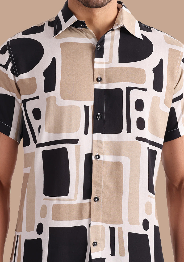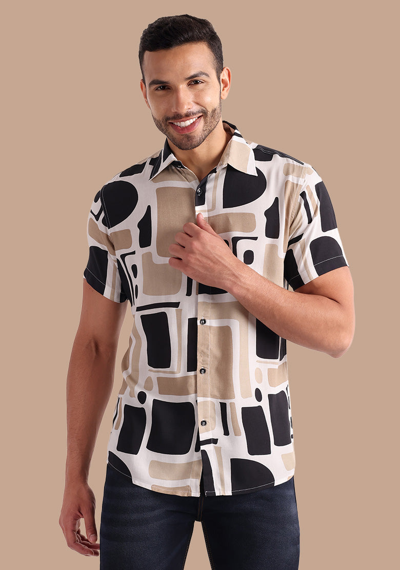 The Vashuqi Printed Button-Up Shirt is crafted from premium viscose rayon fabric, ensuring a comfortable and lightweight feel. The spread collar adds a touch of sophistication, while the curved hemline adds a stylish flair.