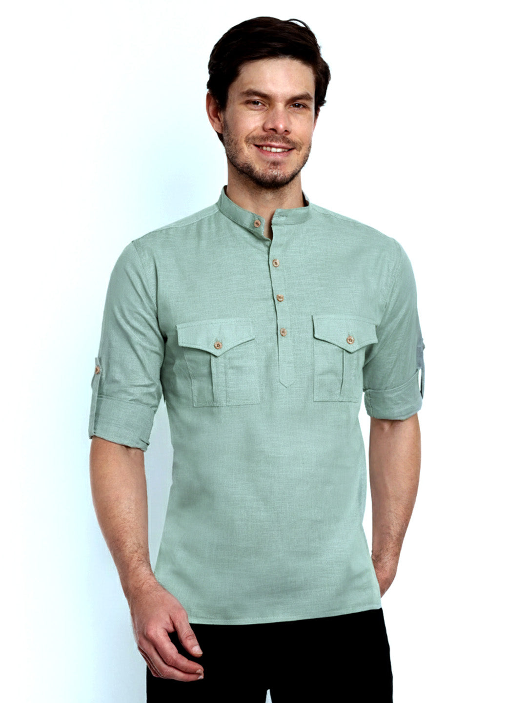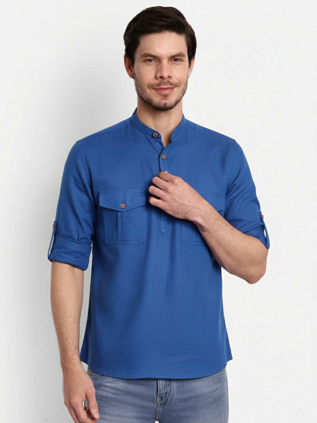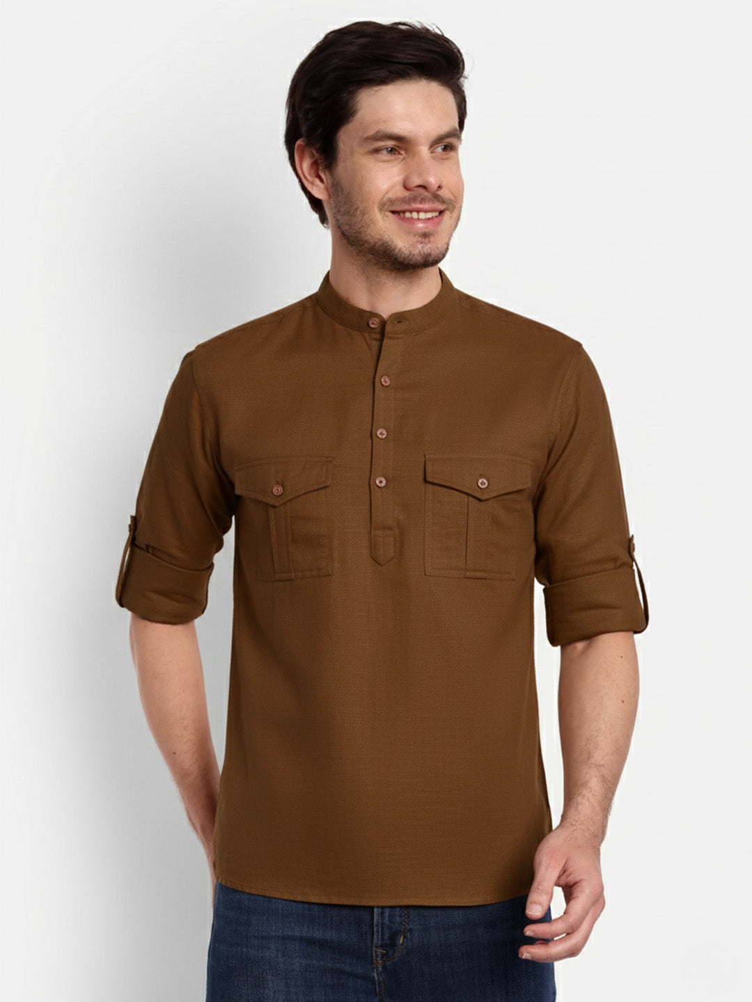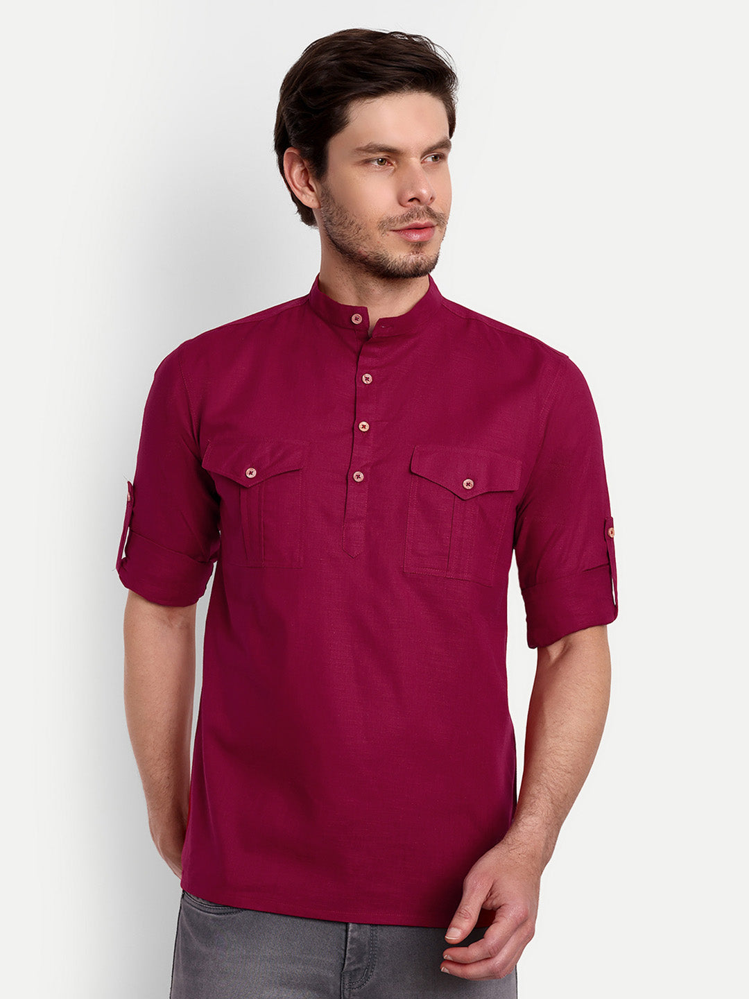 The Men's Casual Slim Fit Full Sleeve Cotton Short Kurta is a must-have in every man's wardrobe. It's crafted from soft and breathable cotton material, making it comfortable to wear all day long. The slim fit design accentuates the natural contours of your body, giving you a sharp and stylish look. The double pocket design adds a touch of utility to this kurta, making it a versatile piece that can be dressed up or down depending on the occasion. The mandarin collar adds a touch of sophistication, making it perfect for formal events and semi-formal gatherings. With its stylish design and practical features, this kurta is a great choice for any man looking to elevate his fashion game.