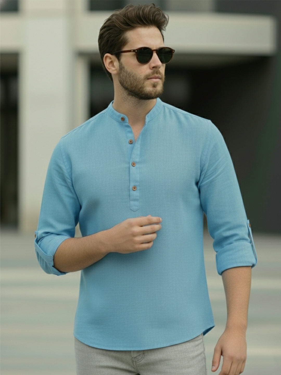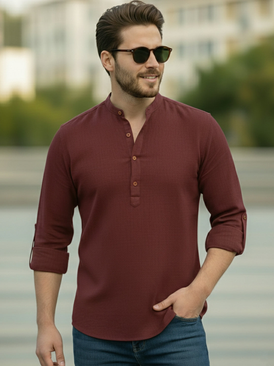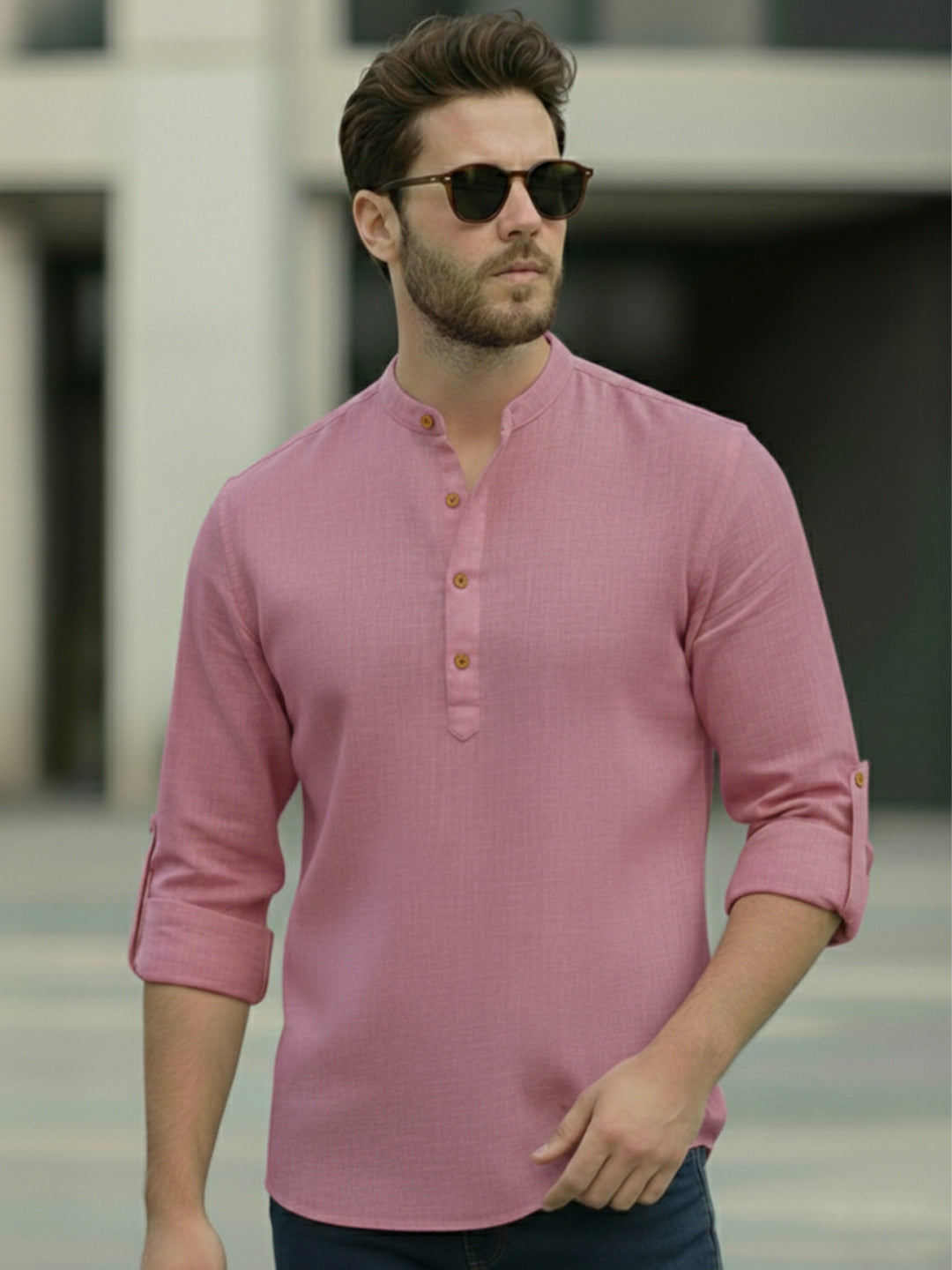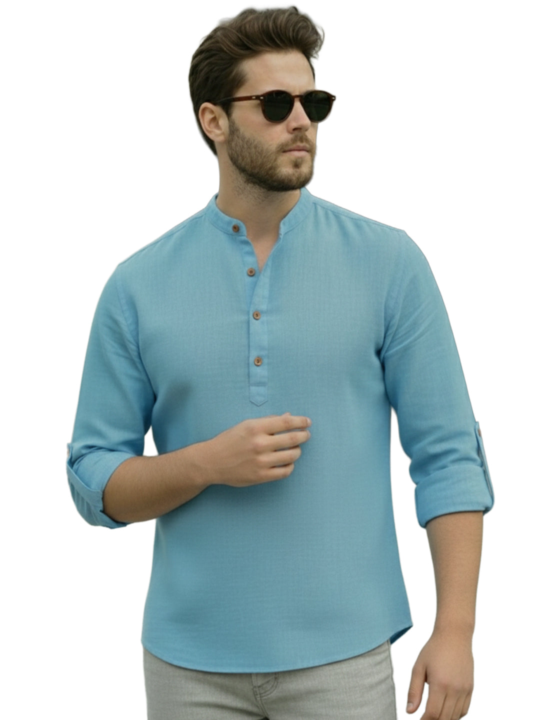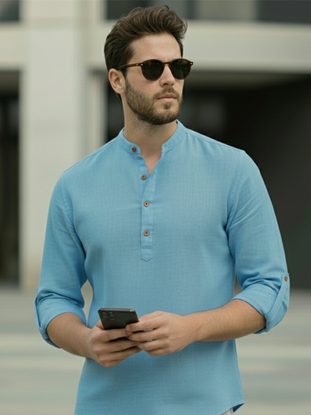 This Men's Full Sleeve Casual Cotton Short Kurta is a stylish and comfortable piece of clothing that is perfect for any casual occasion. Made with 100% cotton fabric, it is soft and breathable, making it ideal for all-day wear. The curved hemline and spread collar give it a smart and sophisticated look, while the button closure ensures a comfortable and secure fit. The full roll-up style sleeves make it easy to adjust the length of the sleeves to suit your preference, and the left pocket adds a practical touch. Available in various colors and sizes, this kurta is a versatile piece that will quickly become a staple in your wardrobe. And with its easy-to-follow wash care instructions, it is also low-maintenance, making it the perfect choice for busy, on-the-go guys.