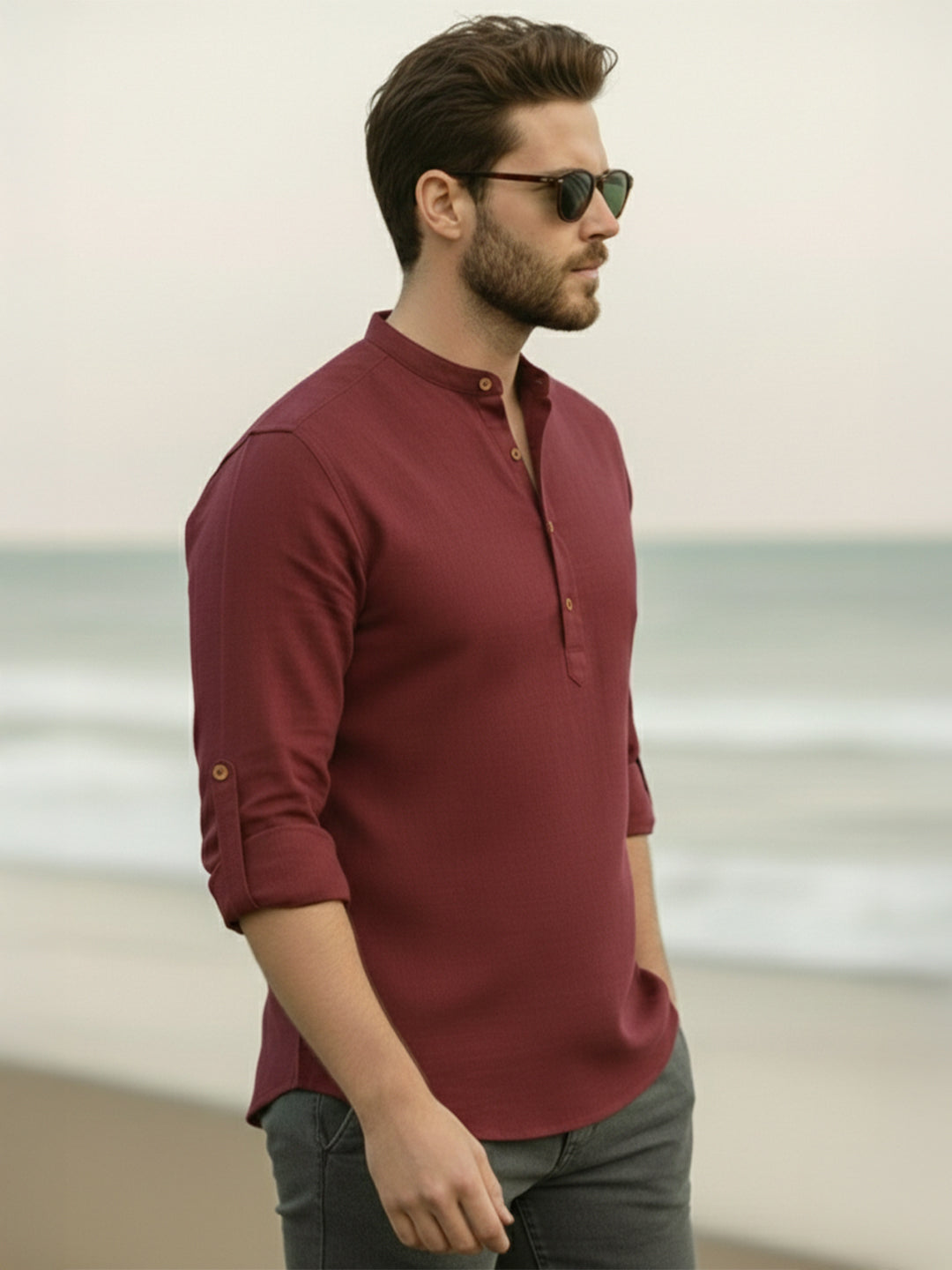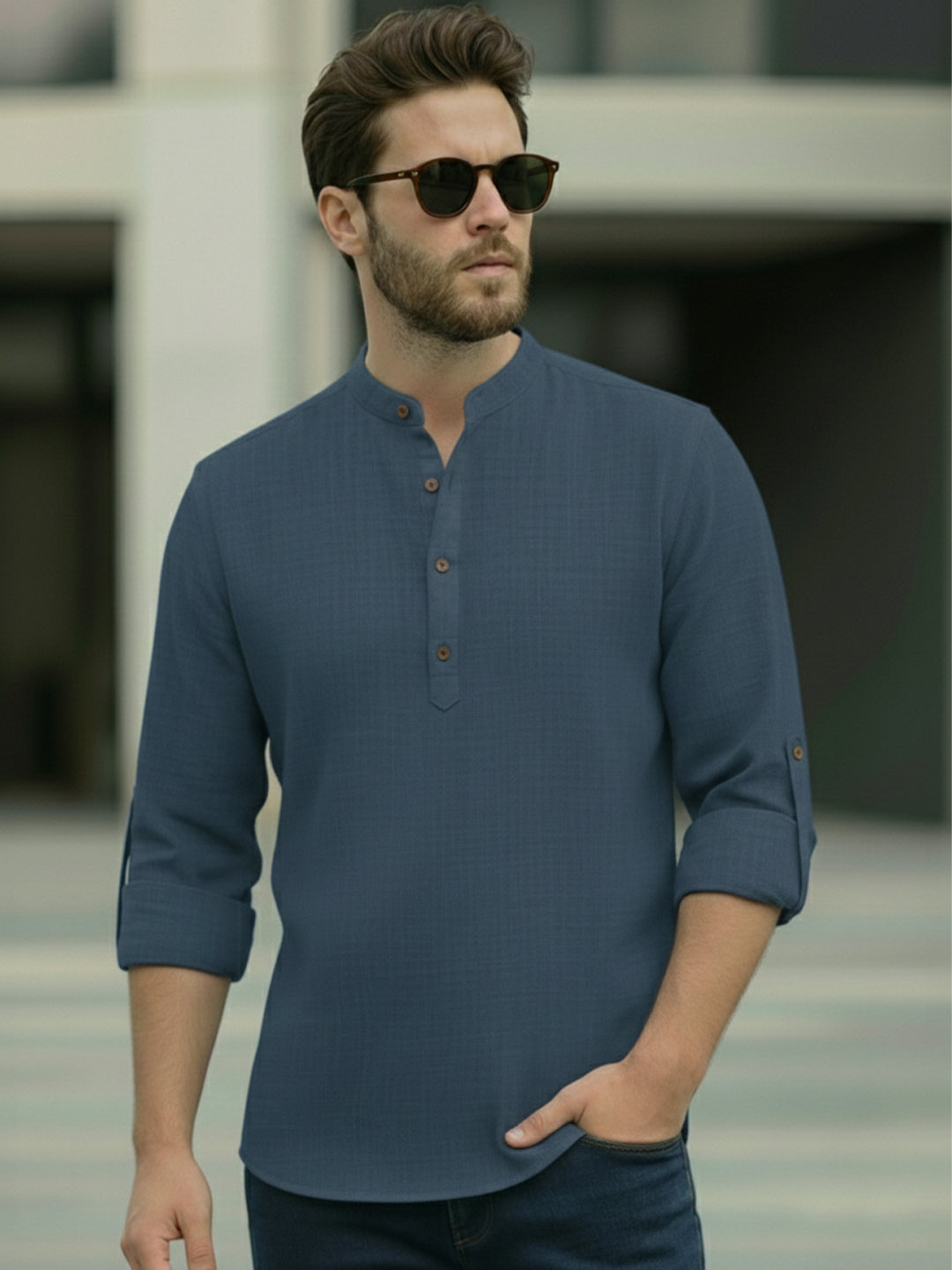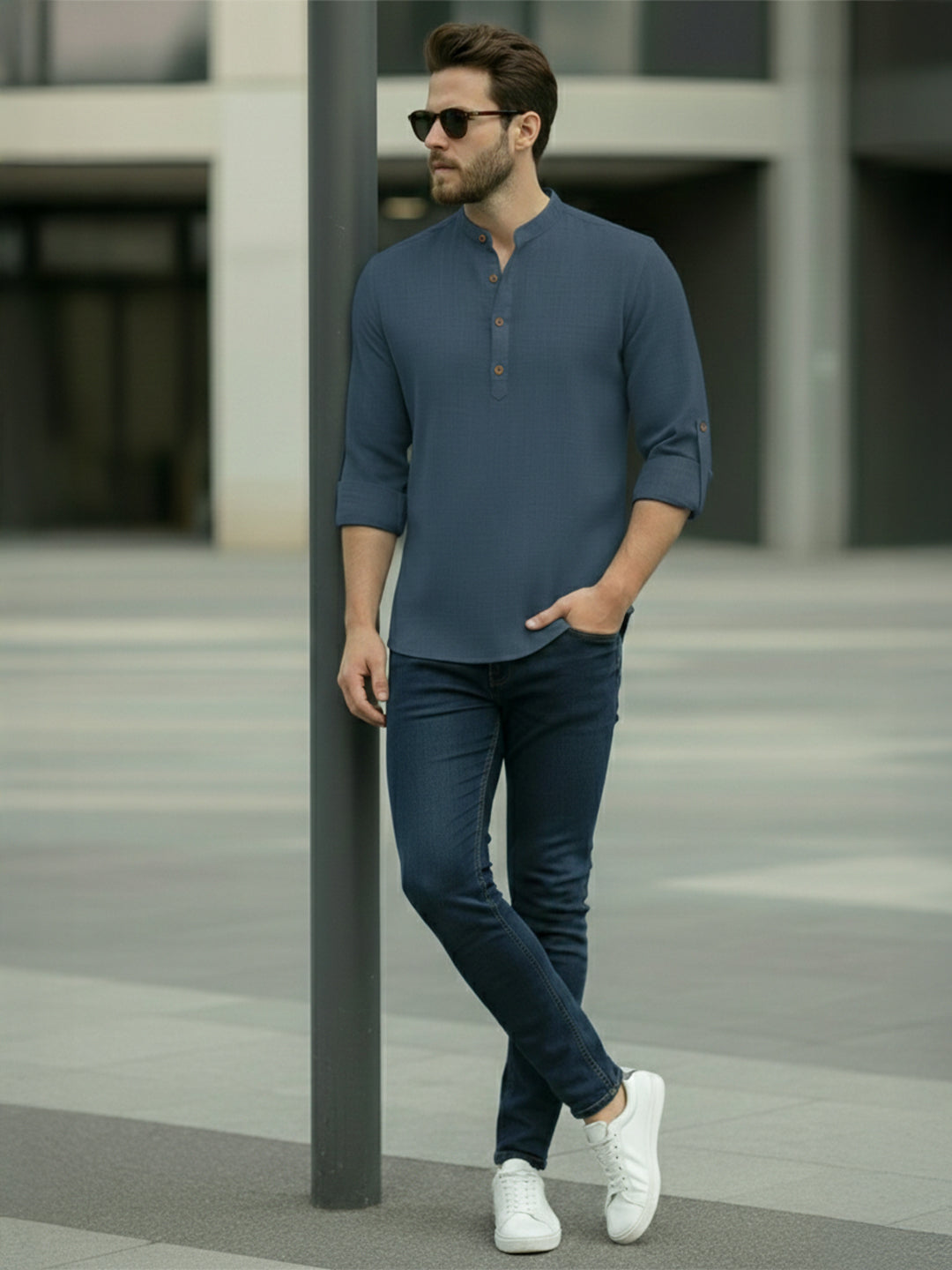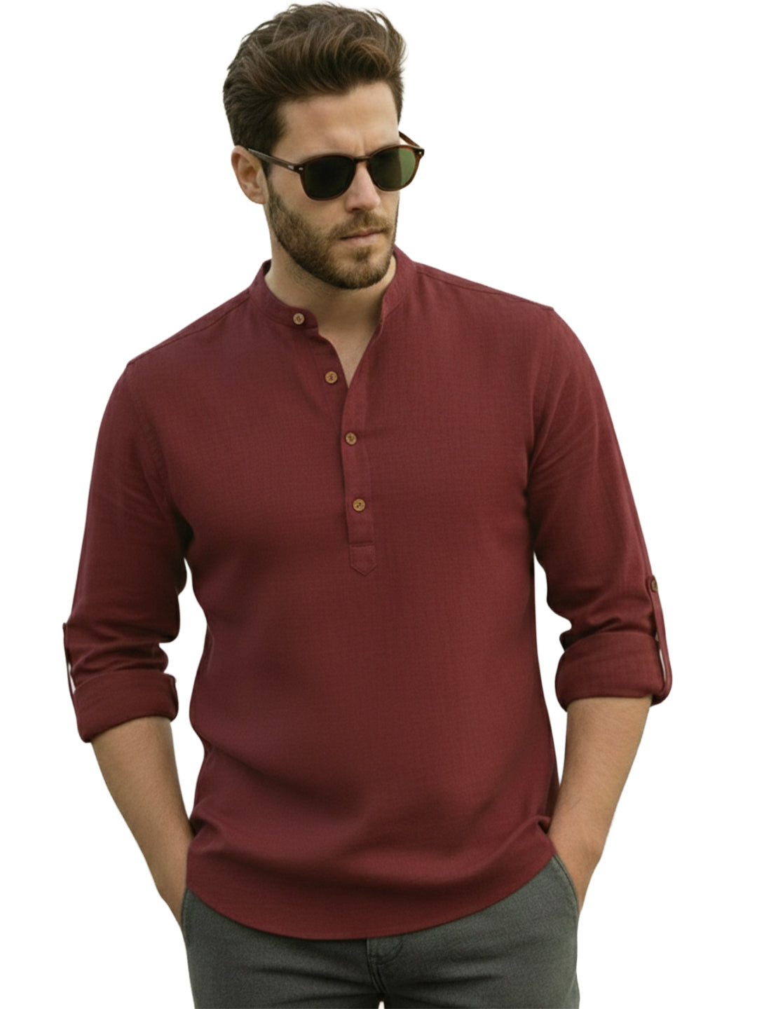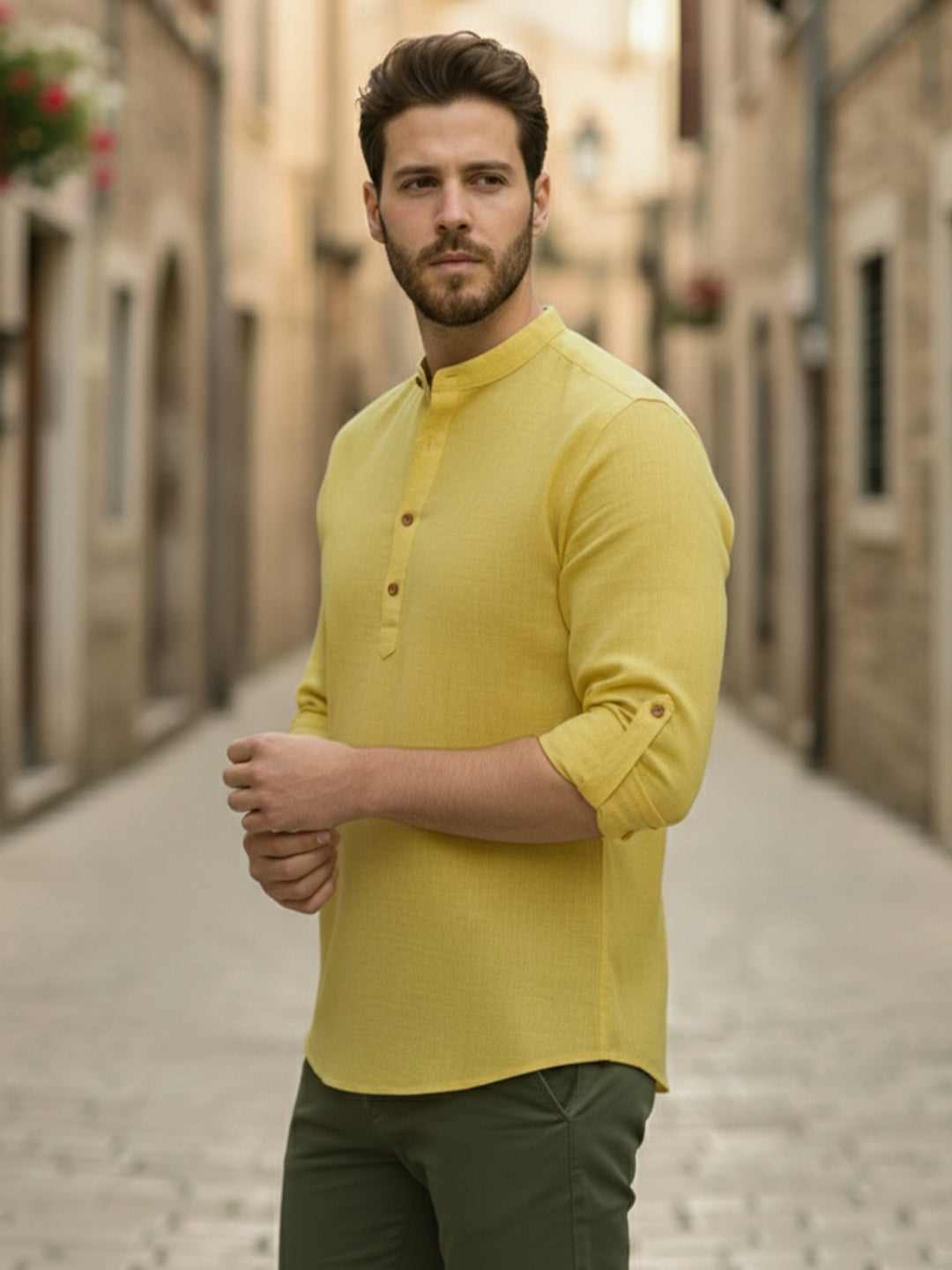 This Men's Full Sleeve Casual Cotton Short Kurta is a stylish and comfortable piece of clothing that is perfect for any casual occasion. Made with 100% cotton fabric, it is soft and breathable, making it ideal for all-day wear. The curved hemline and spread collar give it a smart and sophisticated look, while the button closure ensures a comfortable and secure fit. The full roll-up style sleeves make it easy to adjust the length of the sleeves to suit your preference, and the left pocket adds a practical touch. Available in various colors and sizes, this kurta is a versatile piece that will quickly become a staple in your wardrobe. And with its easy-to-follow wash care instructions, it is also low-maintenance, making it the perfect choice for busy, on-the-go guys.