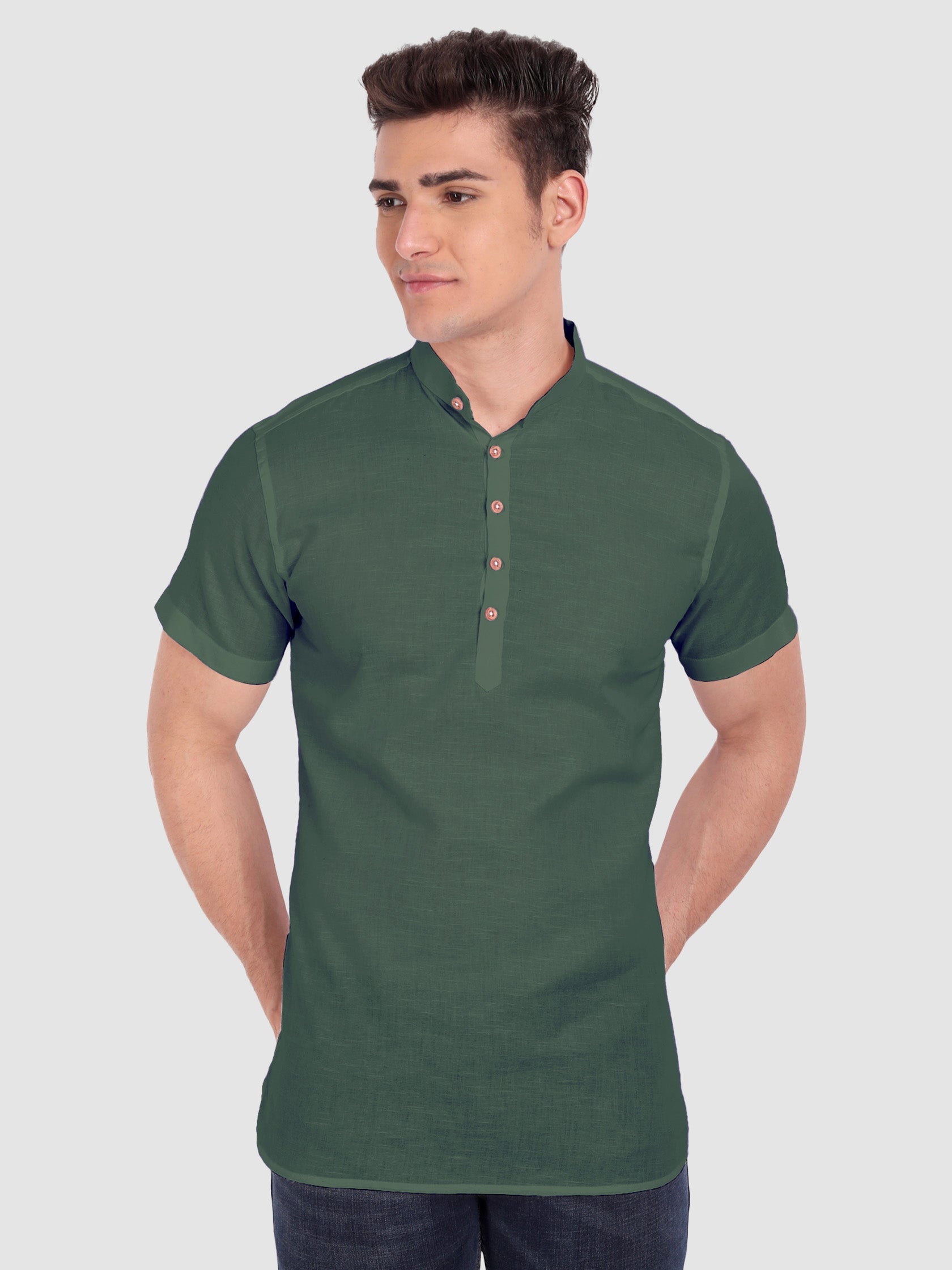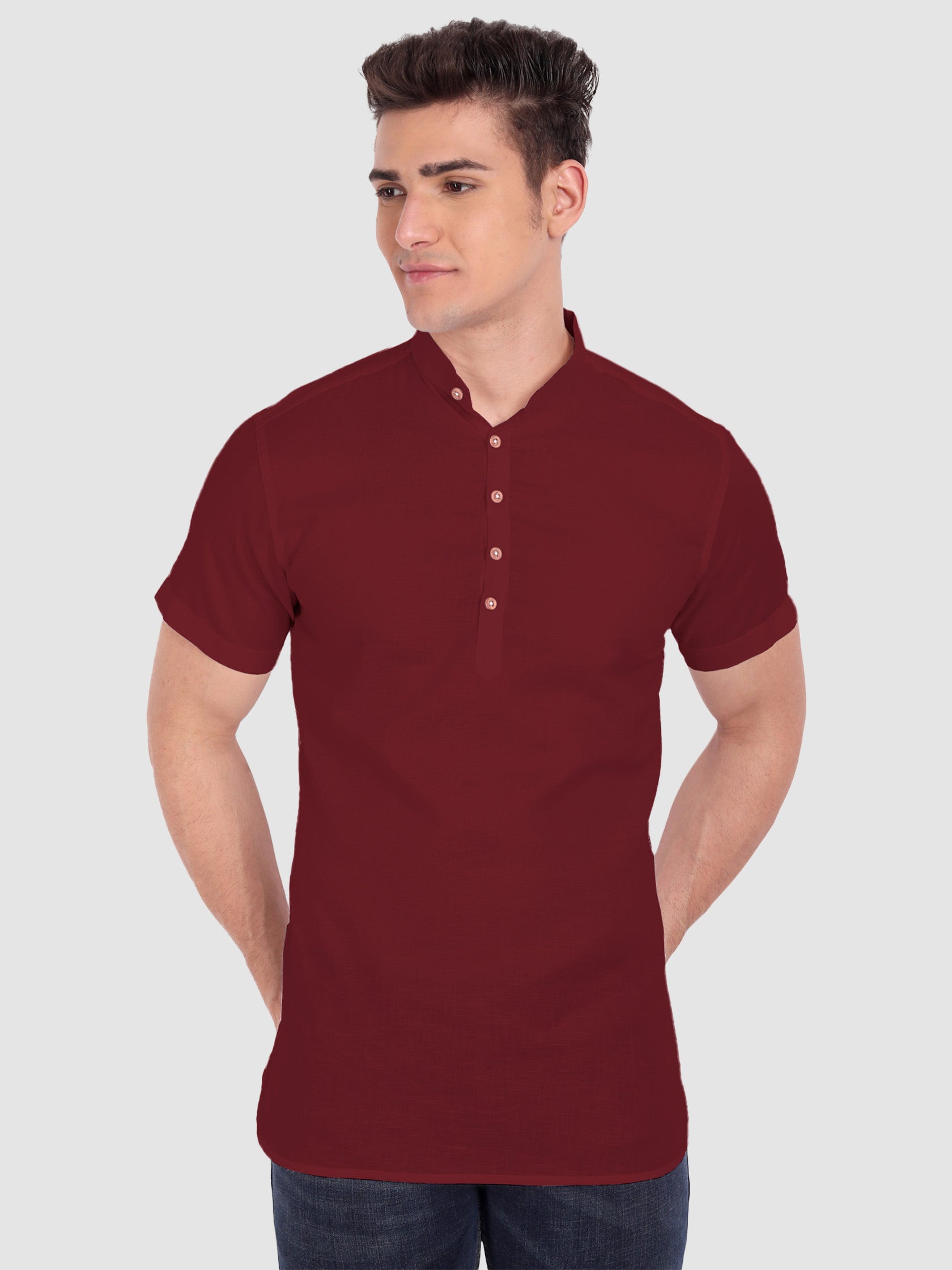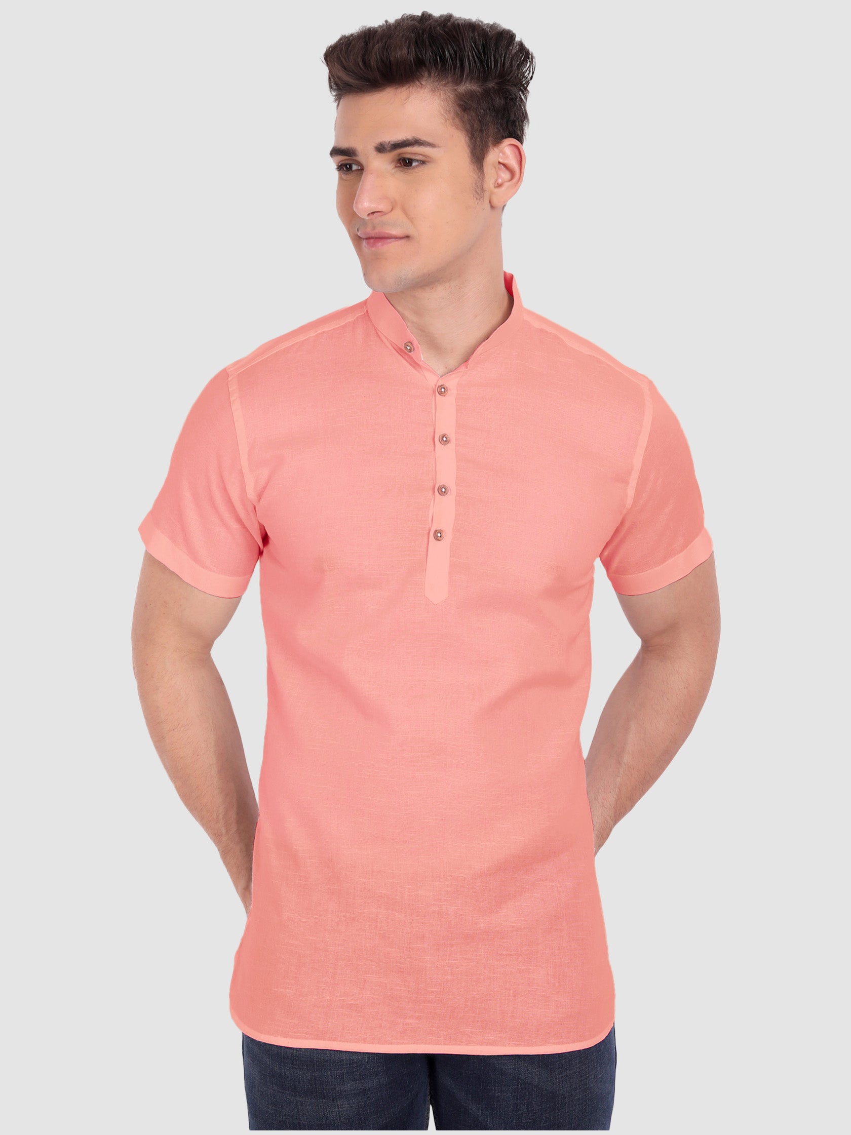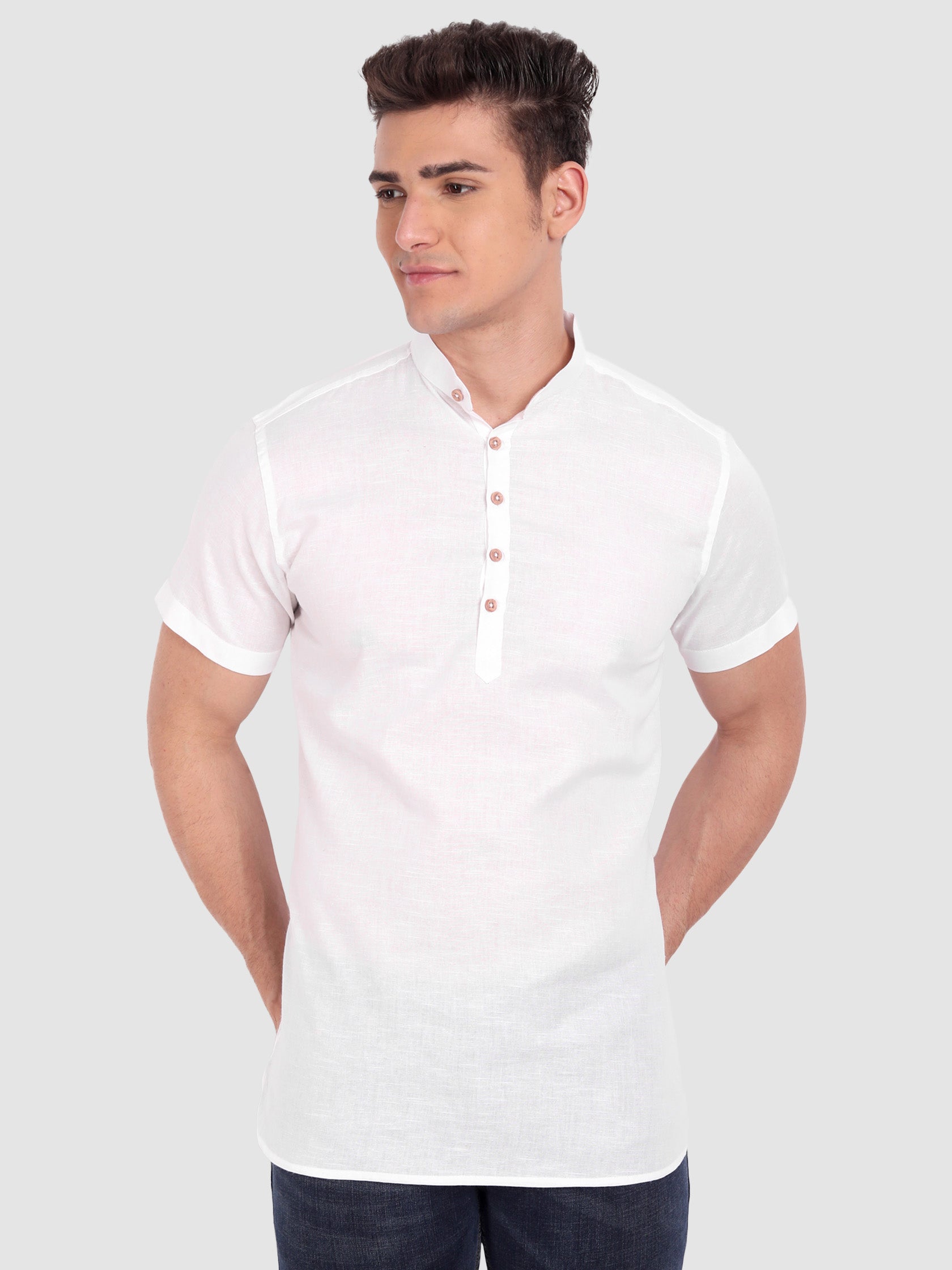 The Men's Casual Slim Fit Half Sleeve Cotton Kurta is a stylish and comfortable piece of clothing that is perfect for summer. It is made with 100% cotton fabric, ensuring breathability and softness for all-day comfort. The button closure provides a secure and adjustable fit, while the mandarin collar and curved hemline add a touch of elegance to the design.
