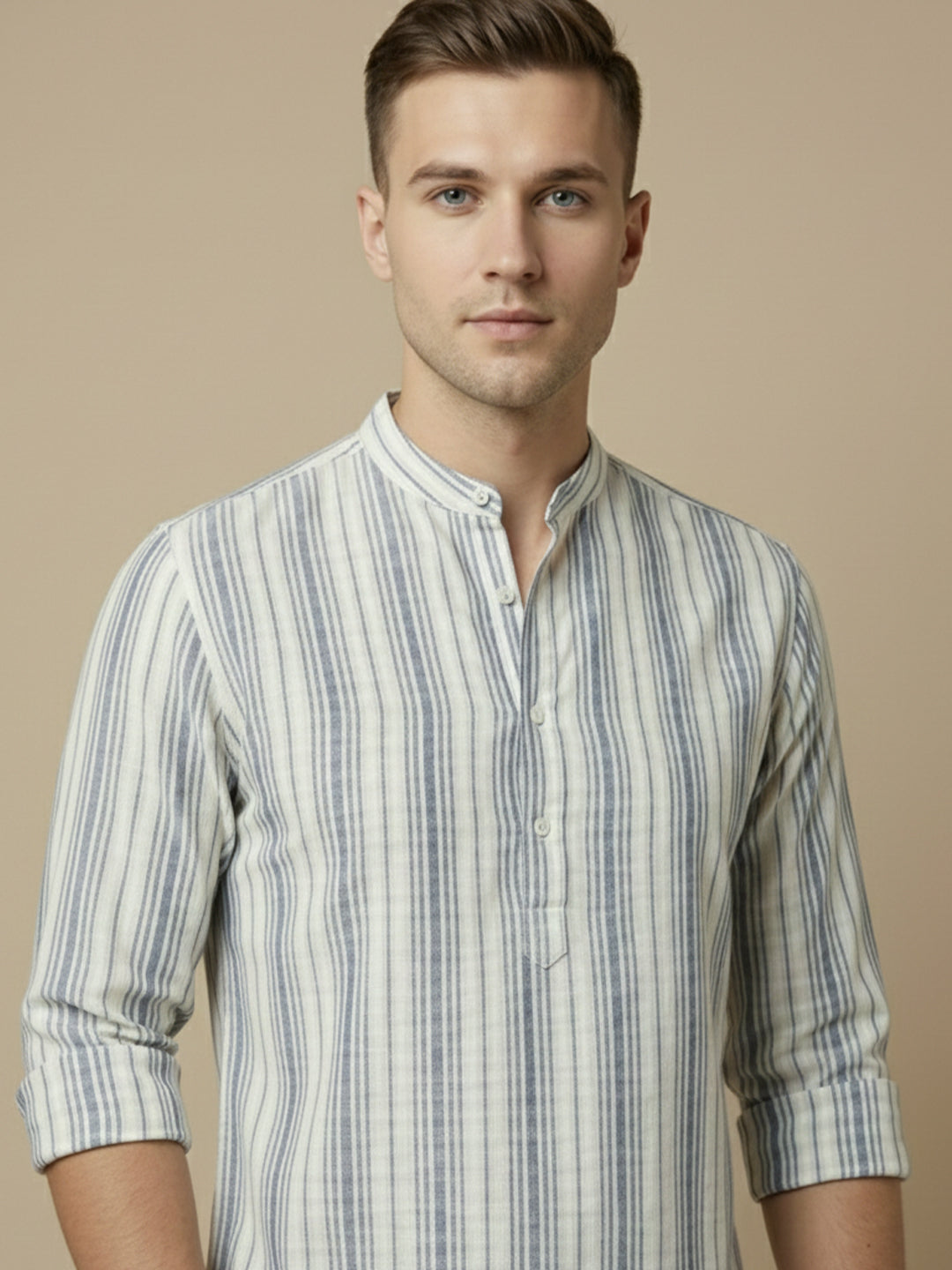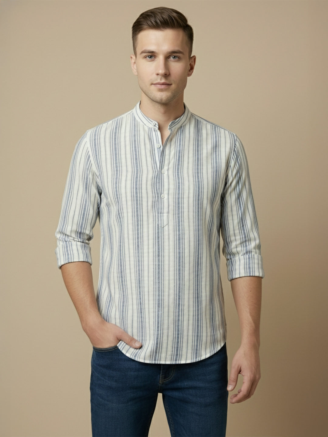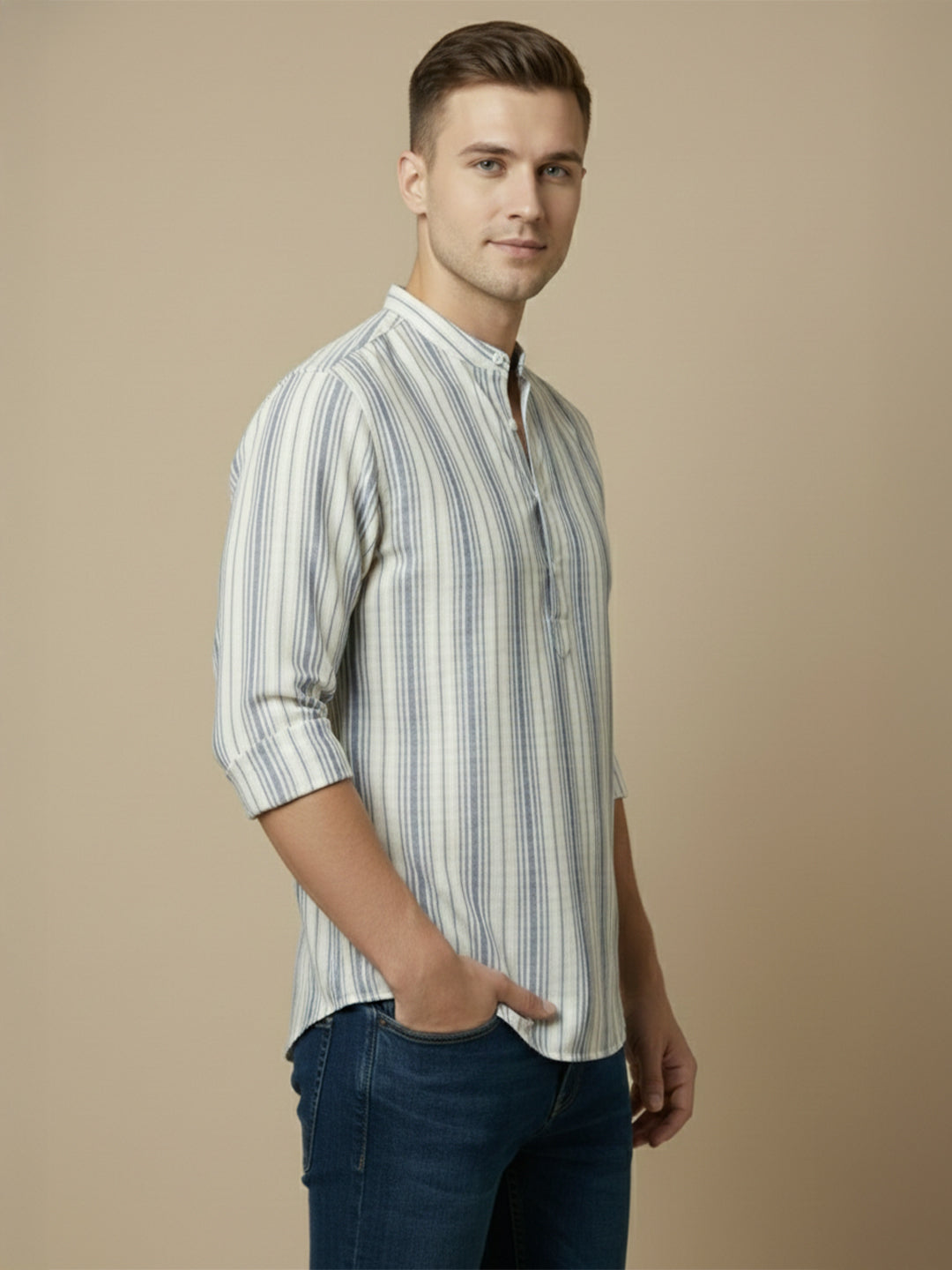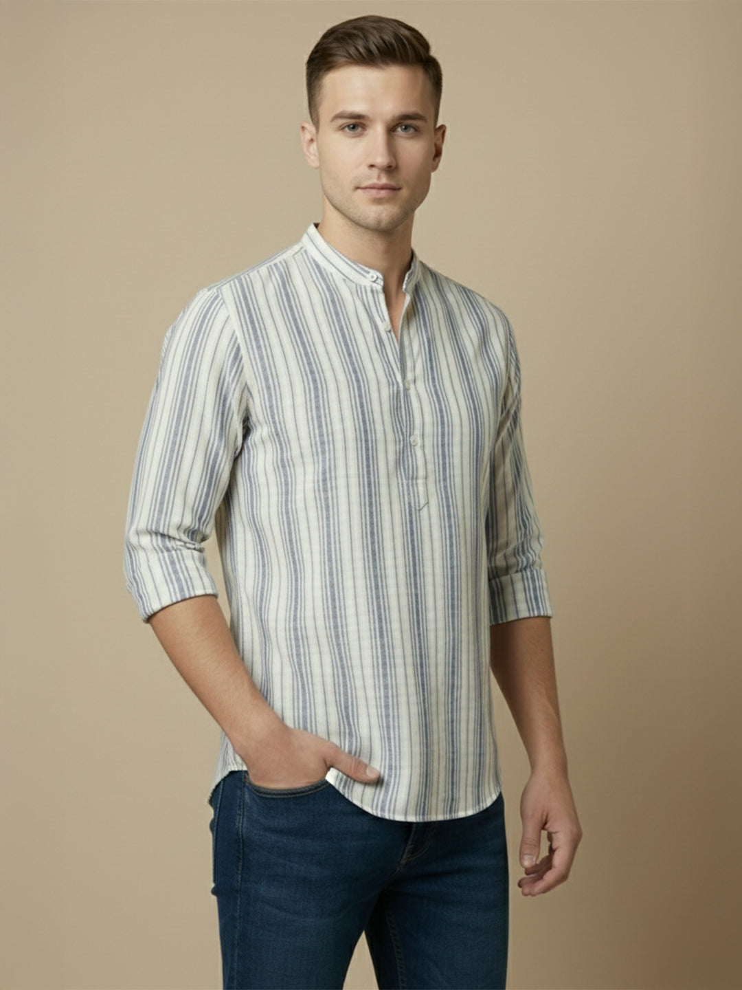 The shirt is designed with a stylish curved hemline and a distinctive mandarin collar, which adds a touch of elegance and sophistication to the overall look.